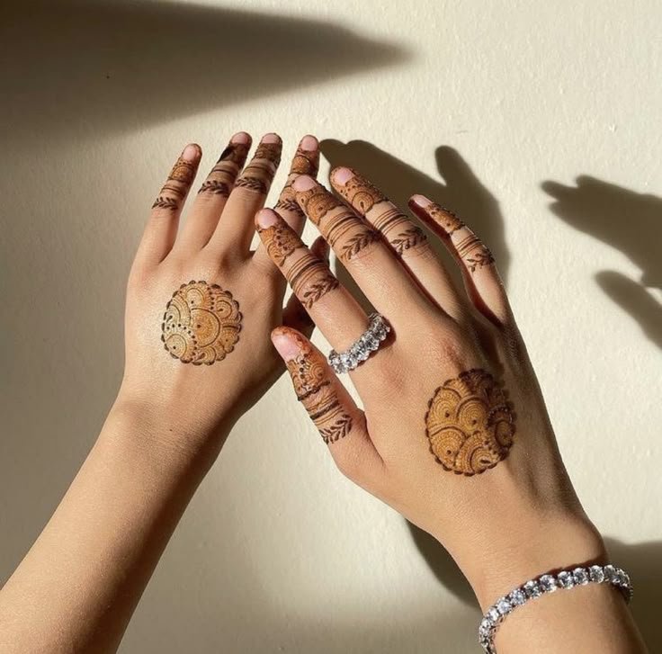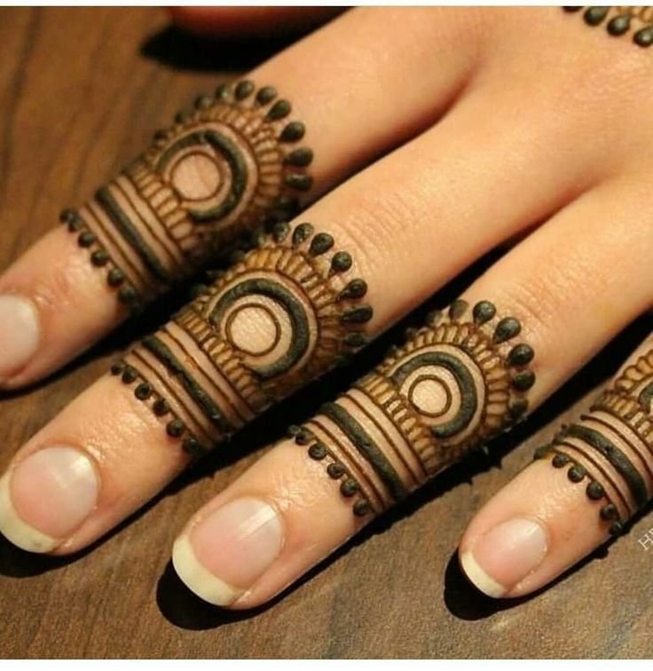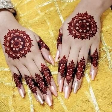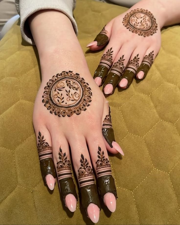 Mandala and tikki mehndi designs never go out of trend. In 2025, these patterns are paired with finger chains and dotted details for a modern touch.