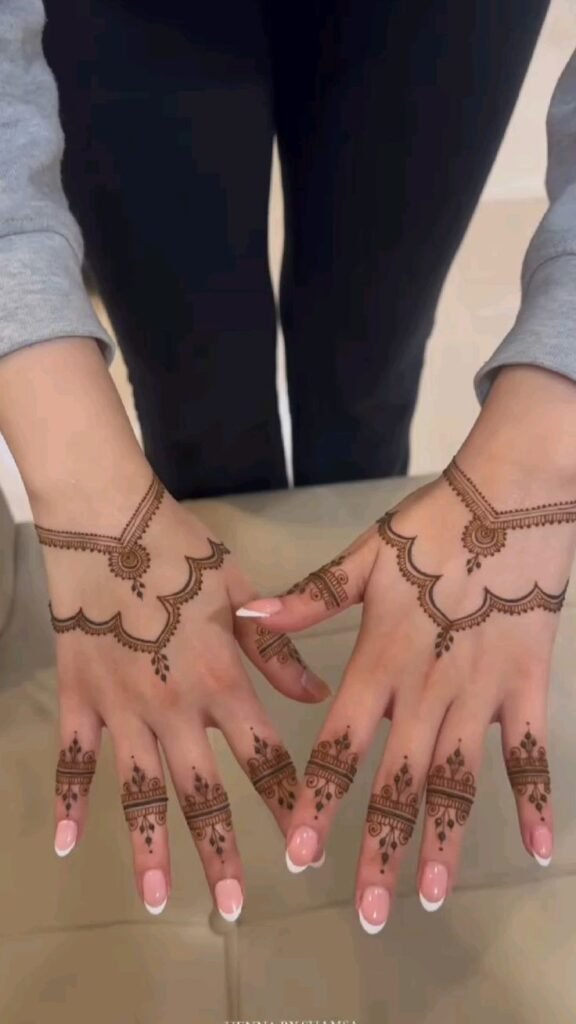 Back-hand mehndi inspired by jewelry is trending in 2025. Bracelet and ring-style designs create a delicate and classy look for Eid and weddings.