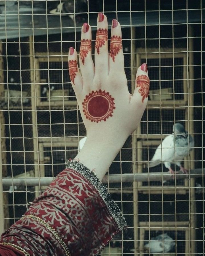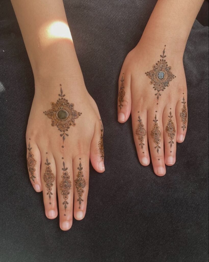A combination of tikki and Arabic flowy patterns extending towards fingers or wrist.
