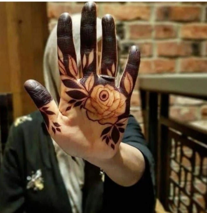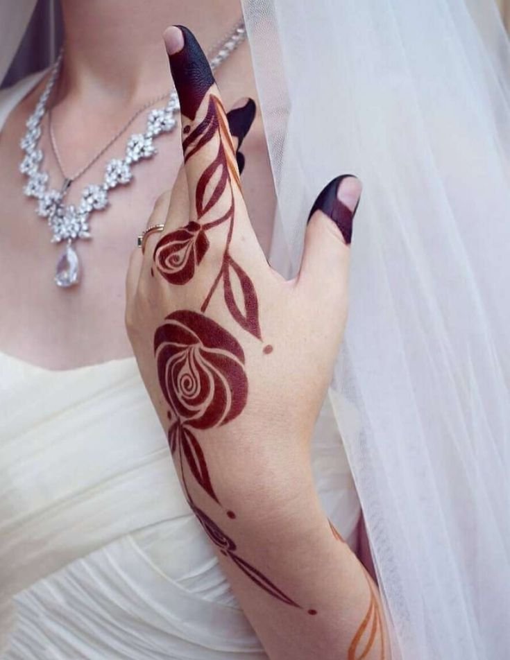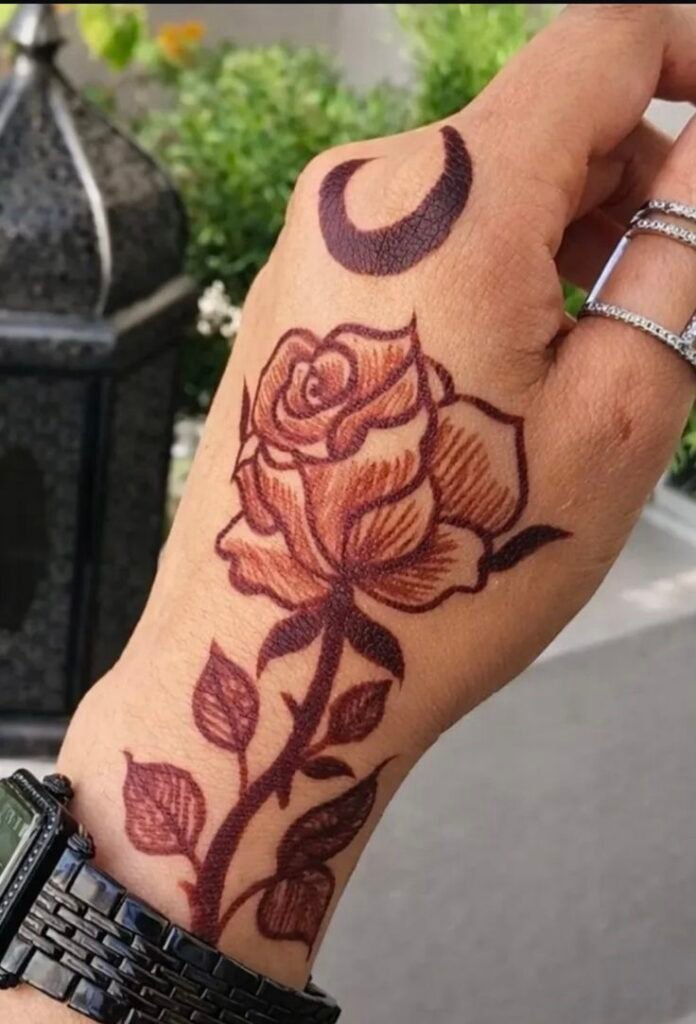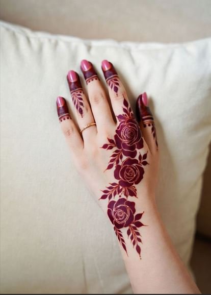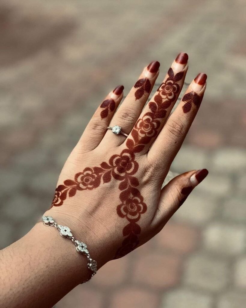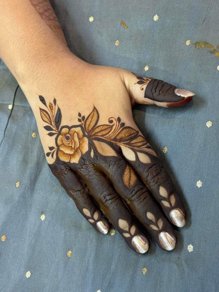 Back hand rose mehndi designs often include a single large rose with leafy trails extending toward the fingers or wrist. This style looks elegant and modern.