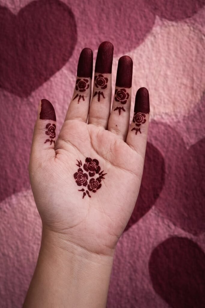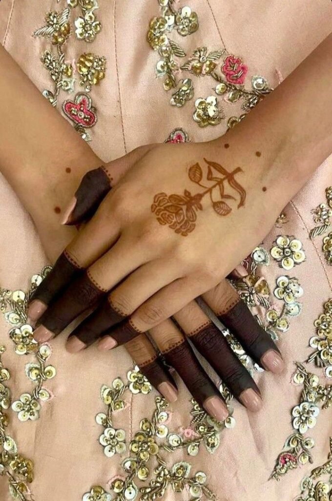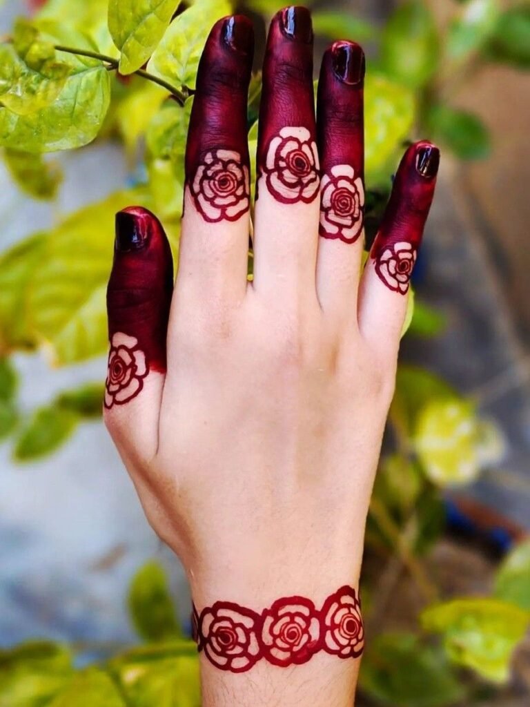 Finger rose mehndi designs highlight fingertips and knuckles using tiny rose motifs. They look trendy and pair well with minimal palm designs.