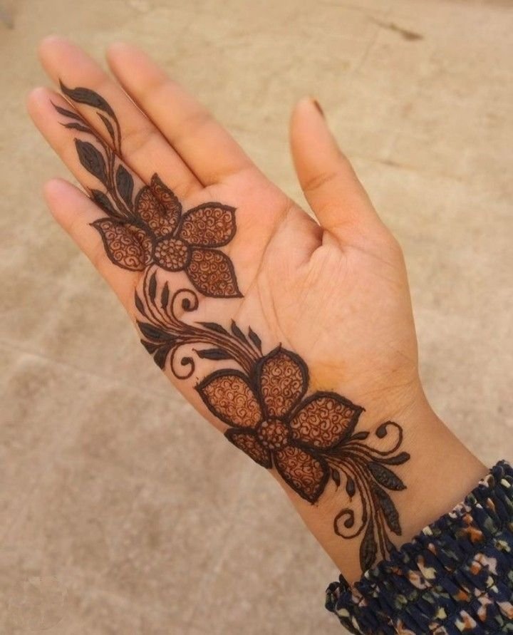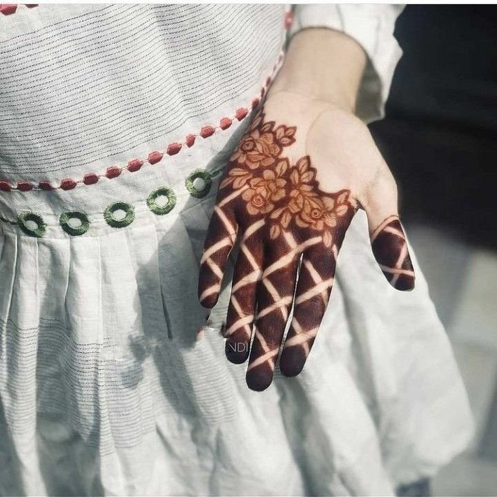 Front hand rose mehndi designs usually feature one or more roses placed in the center of the palm or flowing diagonally across the hand. These designs look beautiful in close-up photography.