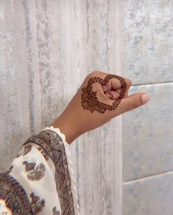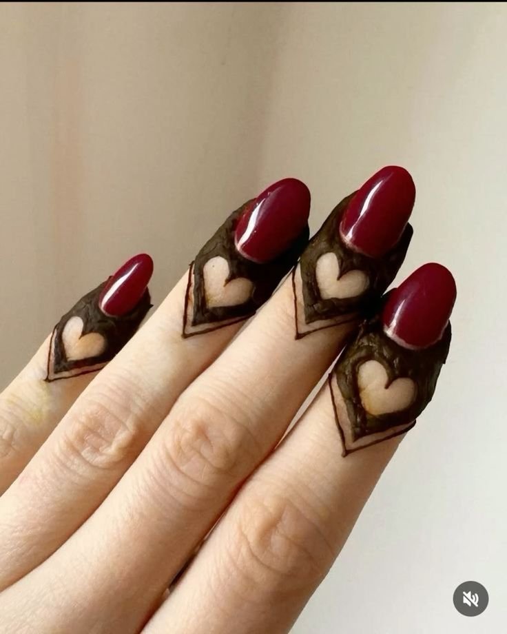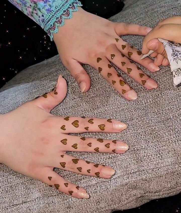 Heart royal finger mehndi design is perfect for a romantic and delicate style. Tiny hearts with floral vines or chains make it ideal for engagements, Valentine’s, or festive events.