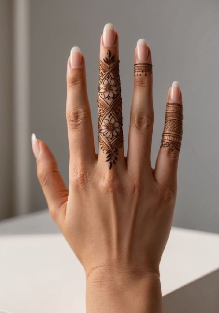 Royal finger mehndi design 2025 trends feature floral vines, geometric patterns, and ring-style designs. These new styles bring a timeless and royal look to every occasion.