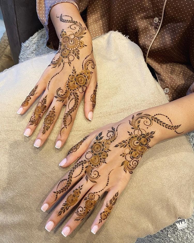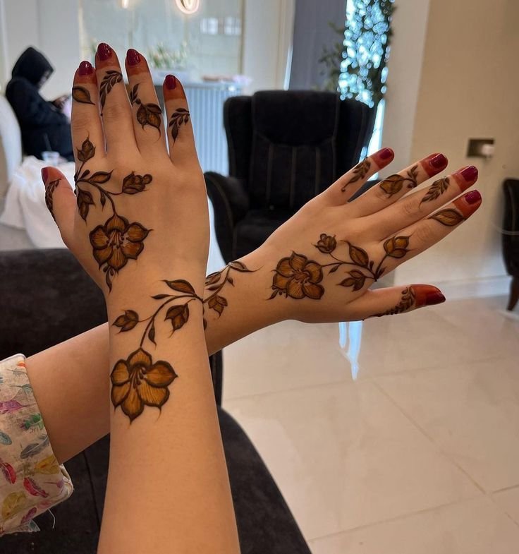 Floral mehndi designs are always a favorite among girls. Small flowers, leafy trails, and soft curves give a feminine and elegant look.