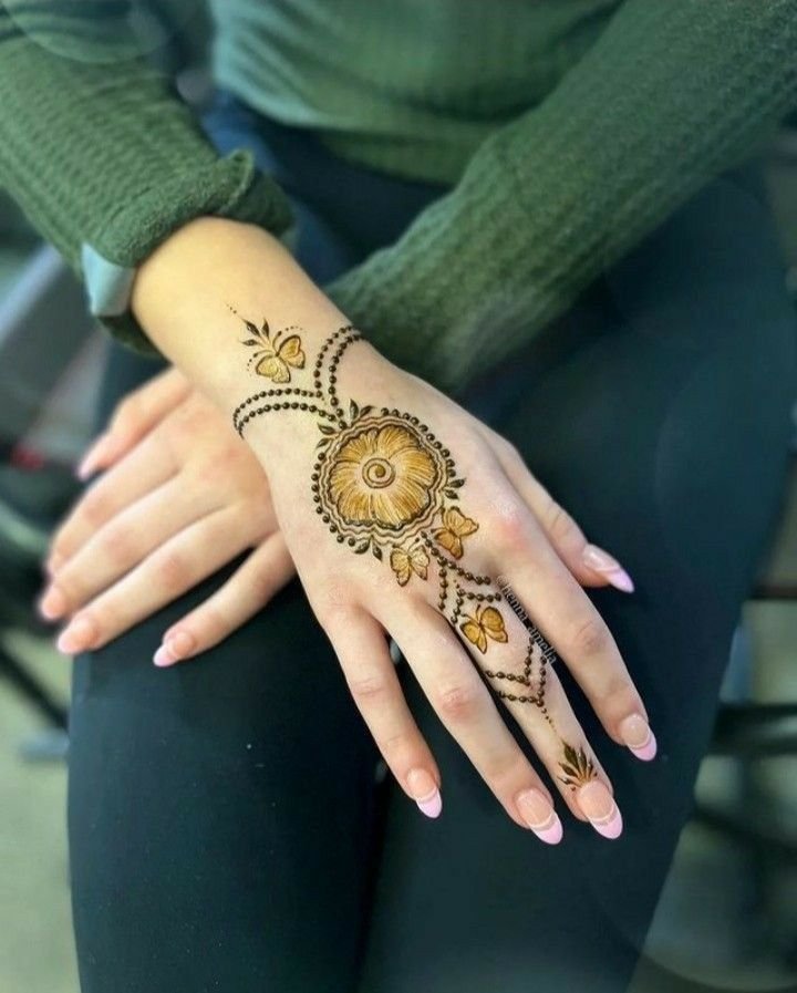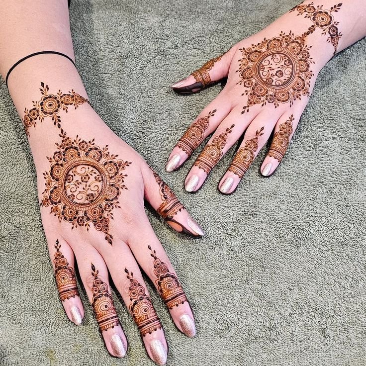 A single mandala in the center of the palm with light finger detailing looks trendy and classy.