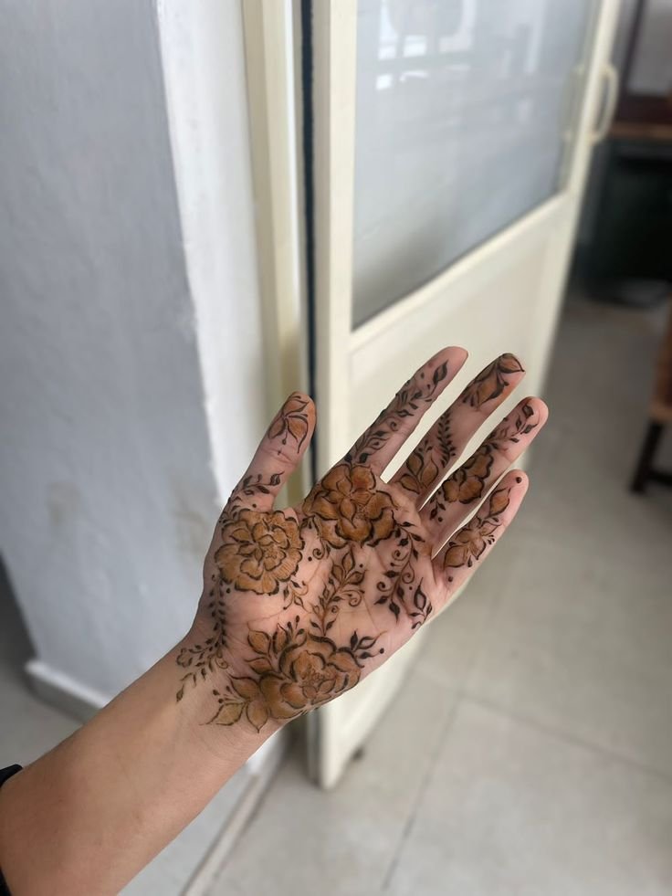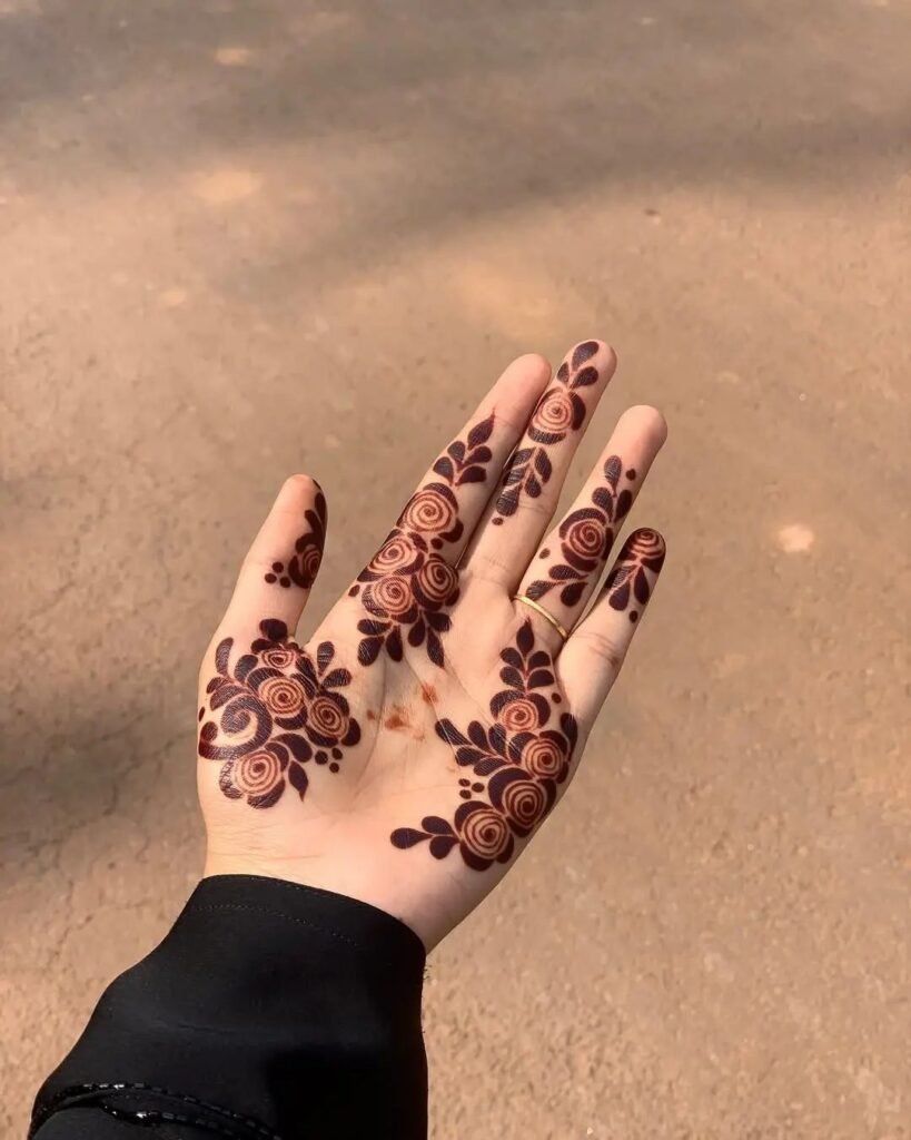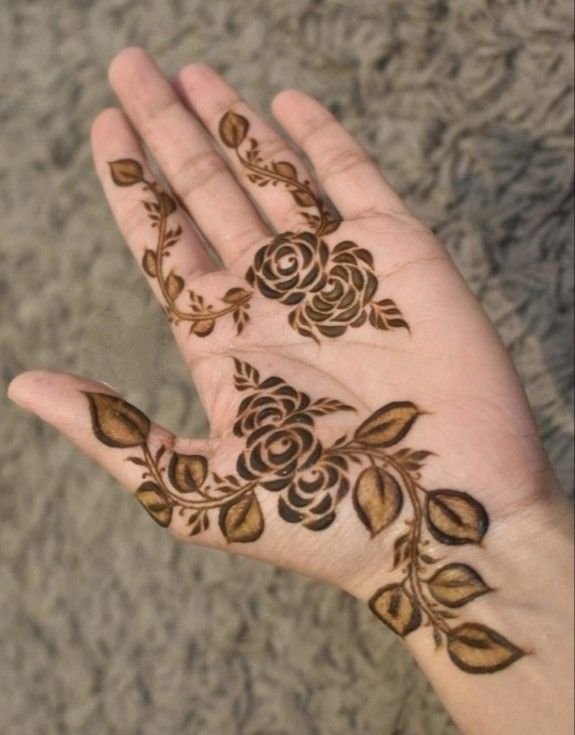 Simple Arabic mehndi designs feature flowing vines, leaves, and open spaces. They create a stylish look without making the hand appear crowded.