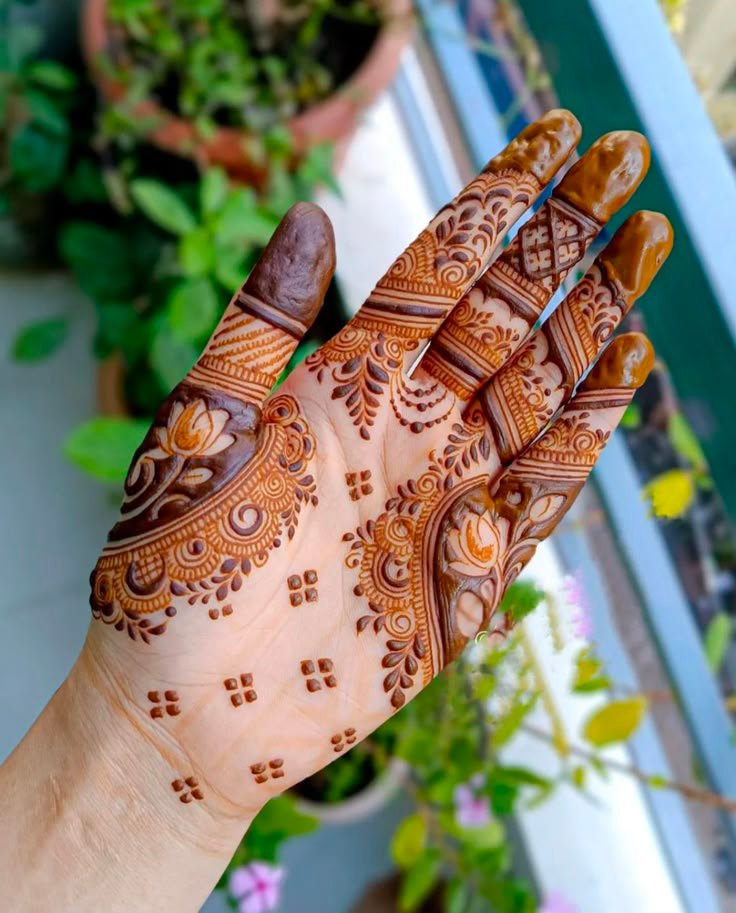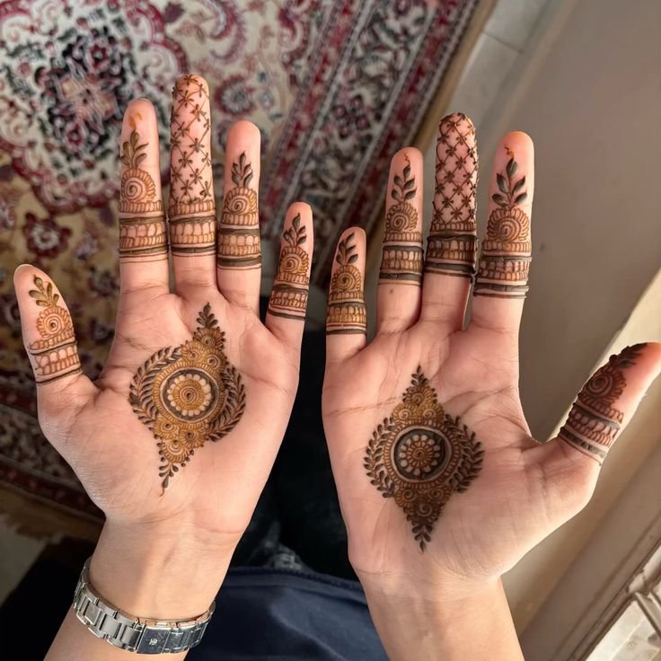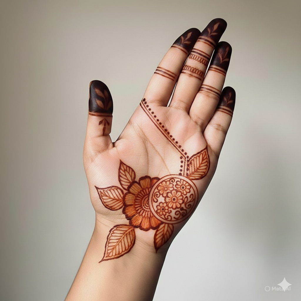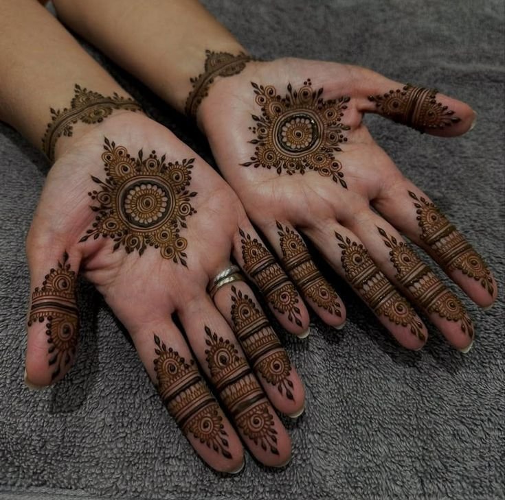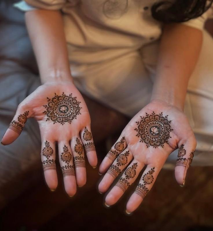 A small mandala in the center of the palm paired with simple finger detailing gives a balanced and classy appearance.