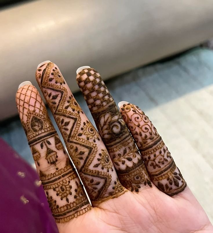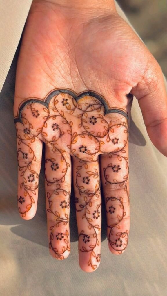 Finger mehndi with dots, lines, and ring-style patterns is trending among girls who prefer a clean and modern look.
