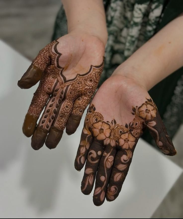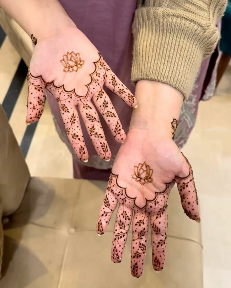 Half hand mehndi designs cover only the palm and fingers, making them perfect for casual wear, Eid, and family gatherings.