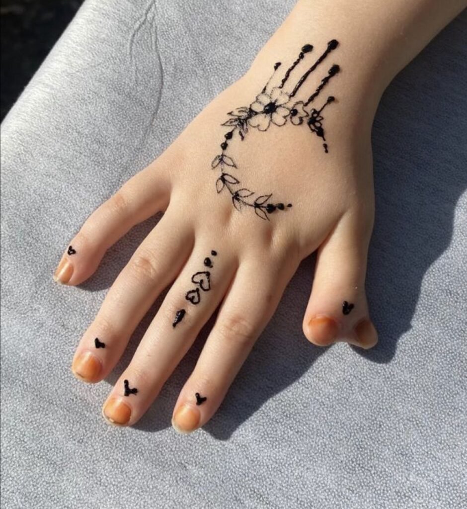 A small line pattern or flower on one finger only. Very simple, modern, and kid‑friendly.