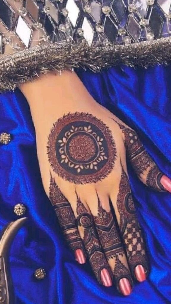 The stylish back hand mehndi design circle is one of the most traditional yet trending designs. The circle in the center of the hand often symbolizes elegance and completeness. Surrounded by delicate dots, flowers, or geometric shapes, it’s a timeless pattern that looks stunning on all hand types.