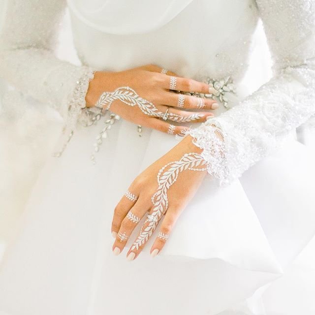 Brides love white henna because it looks luxurious and different. White henna tattoo style mehndi designs enhance bridal outfits and jewelry beautifully.