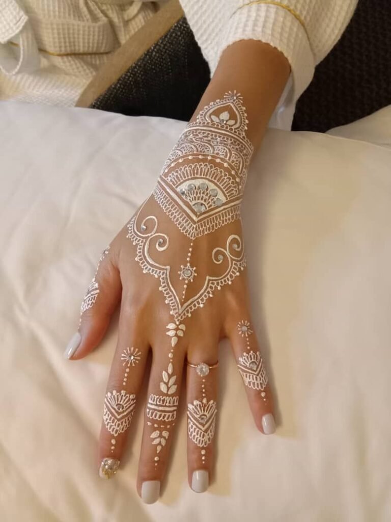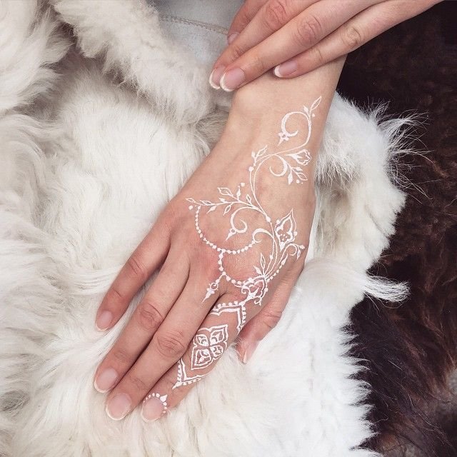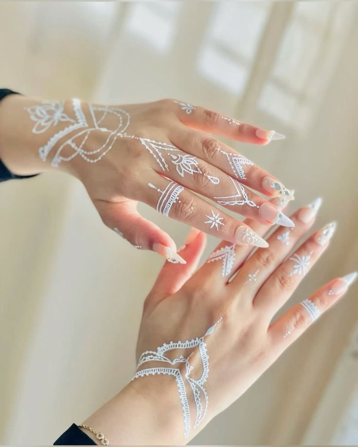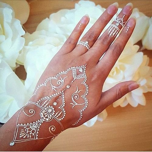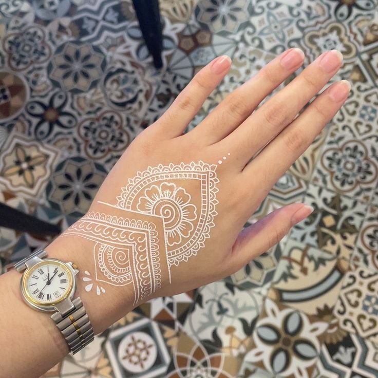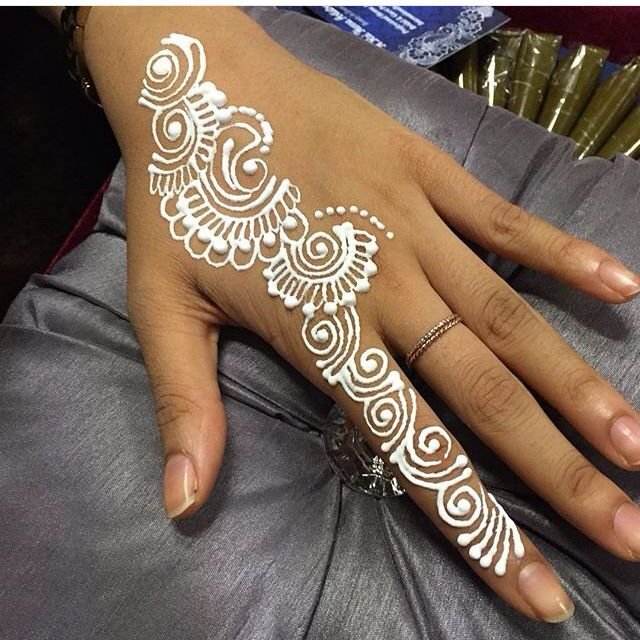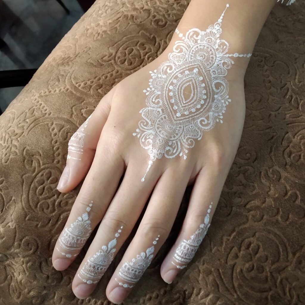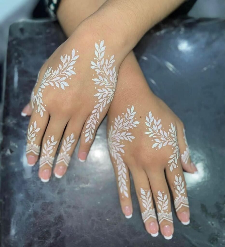 White henna designs on hands look delicate and eye-catching. Floral patterns, vines, and mandala styles are the most popular choices.
