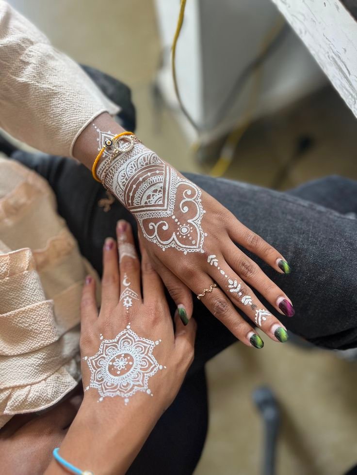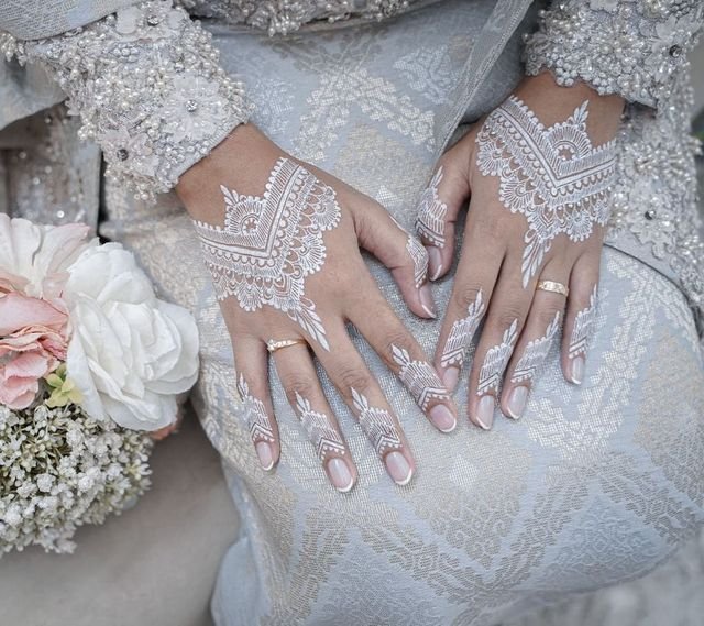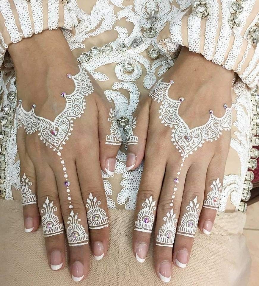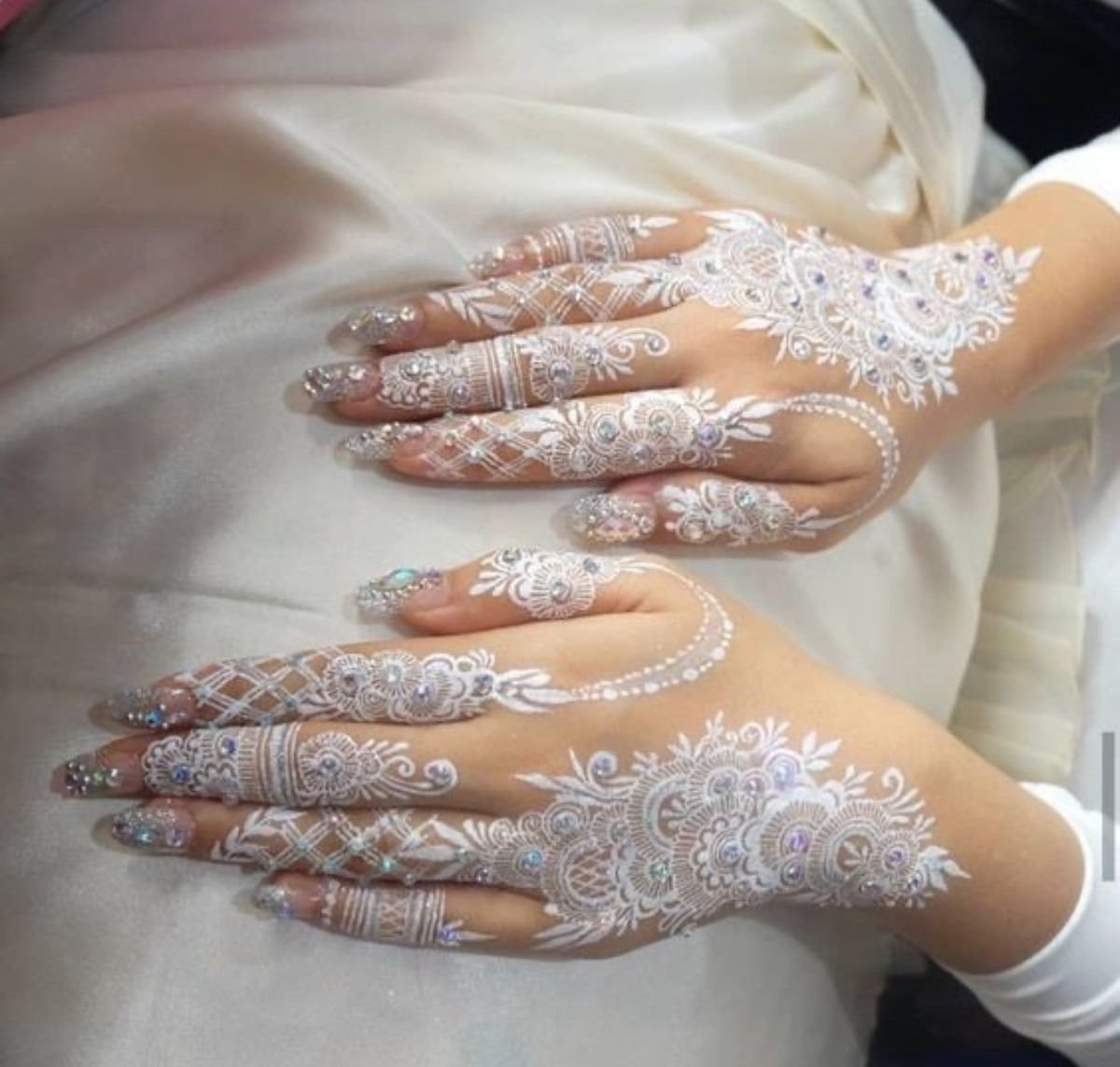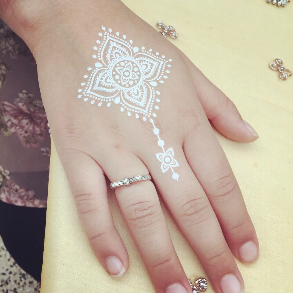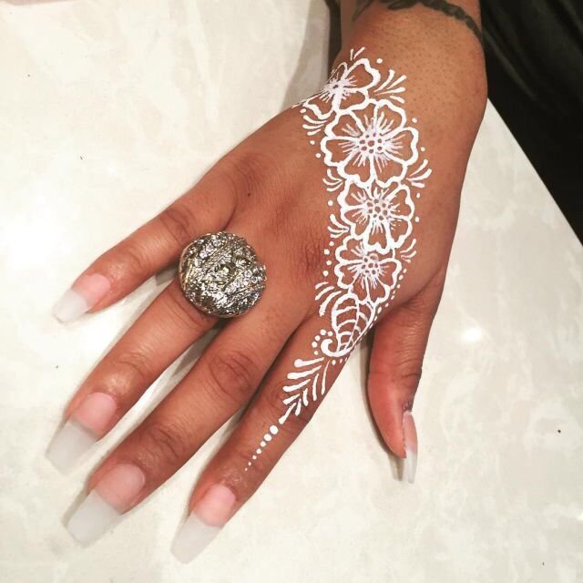 White henna designs on hands look delicate and eye-catching. Floral patterns, vines, and mandala styles are the most popular choices.