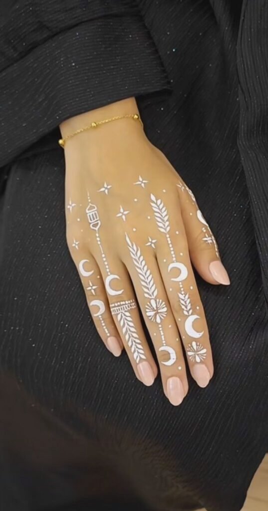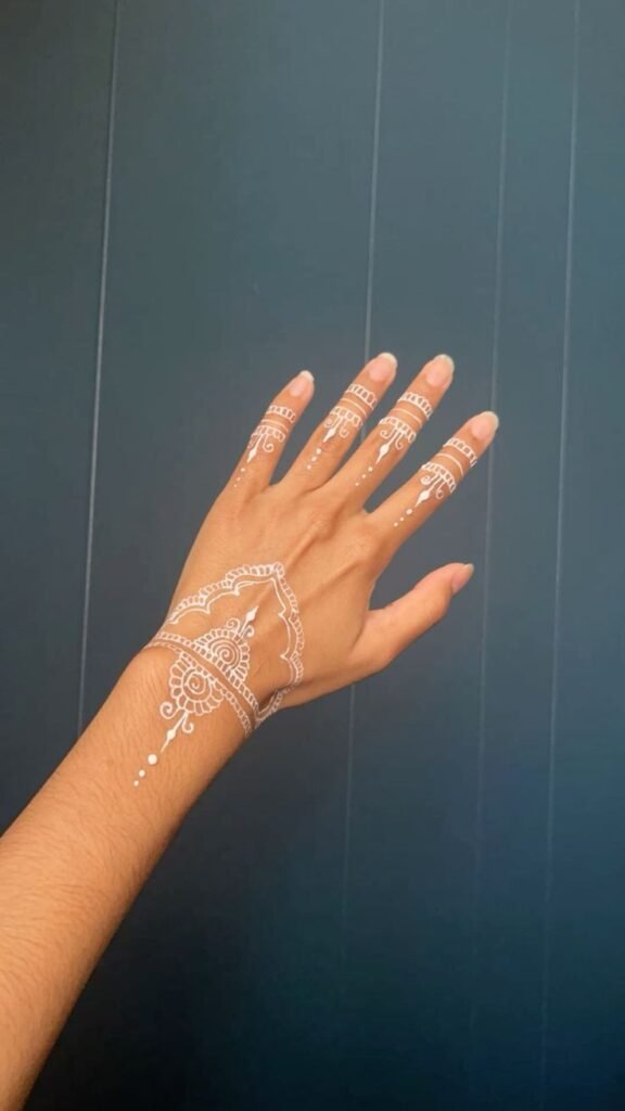 Minimal white henna designs are simple yet very stylish. Thin lines, small flowers, and geometric shapes give a modern tattoo-like appearance.